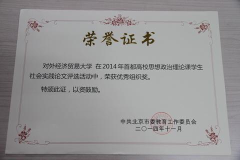 (思政教研部)11月24日,北京市委教育工作委员会表彰2014年首都高校思想政治理论课学生社会实践优秀论文、指导教师和组织奖,思政教研部思修课教师(研工部辅导员)李孟一老师指导的团队获得特等奖,思政教研部思修课教师李海英指导的团队获得二等奖,李孟一老师获得优秀指导教师奖,我校获得优秀组织奖。这是继去年我校斩获该市级比赛一等奖之后,今年再获特等奖和优秀组织奖殊荣。